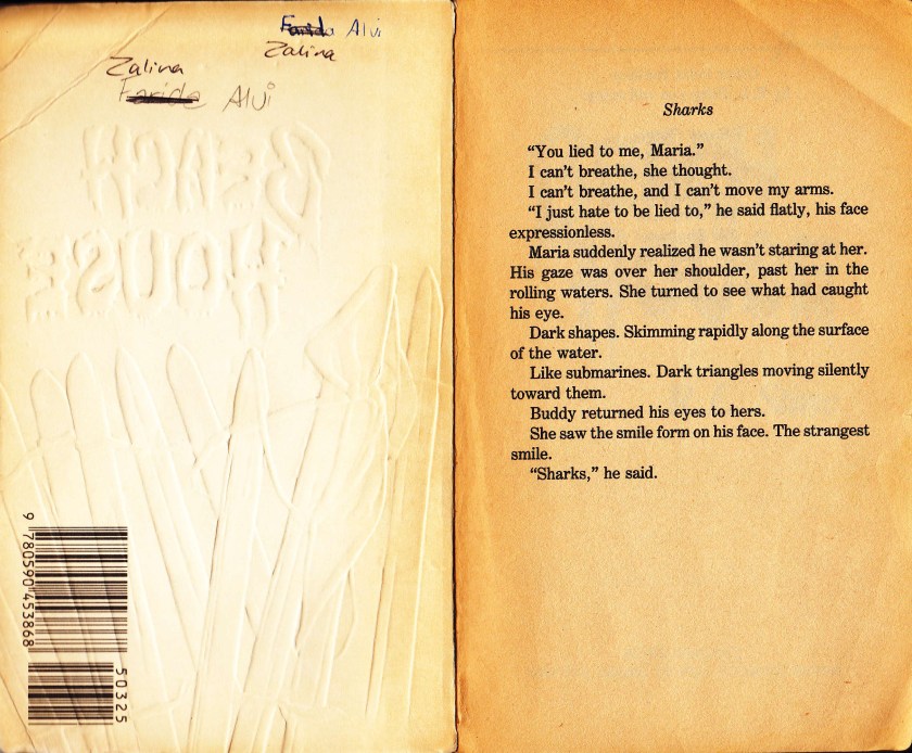 It wasn’t the first novel I ever bought, though. The first one was called Mad, Mad Monday by Herma Silverstein; it was about a teenage girl who conjures up the ghost of a dead jock named Monday when her loves spell goes awry. It says “Zalina Alvi Grade 2 Mkay Room 6.” I love imagining my seven-year-old self reading that book – almost as much as I love seeing my sister’s name crossed out and replaced with mine on the front cover of R.L. Stine’s Beach House. The tagline on the back reads “Swim. Sunbathe. Die.” Good times.